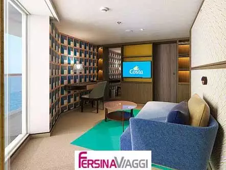 Suite di ca. 37 mq. con balcone privato, salone con divano letto singolo, letto matrimoniale, aria condizionata e bagno con doccia con termostato individuale, TV interattiva e satellitare a schermo piatto, telefono, minibar, cassaforte e asciugacapelli
