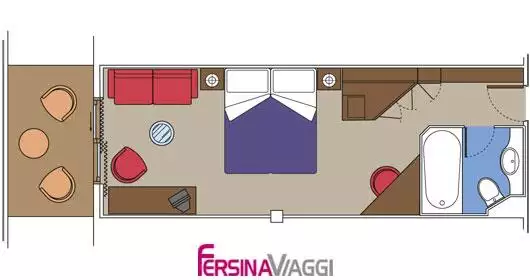 Cabine con Balcone Cabine con balcone privato e letto matrimoniale convertibile in due letti singoli (su richiesta). Aria condizionata, bagno con doccia, accesso internet via cavo (a pagamento), TV, telefono, minibar, cassaforte.
